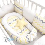 Naziv proizvoda: Ogradica i posteljina za krevetac za bebe – Cik cak žuto sivi